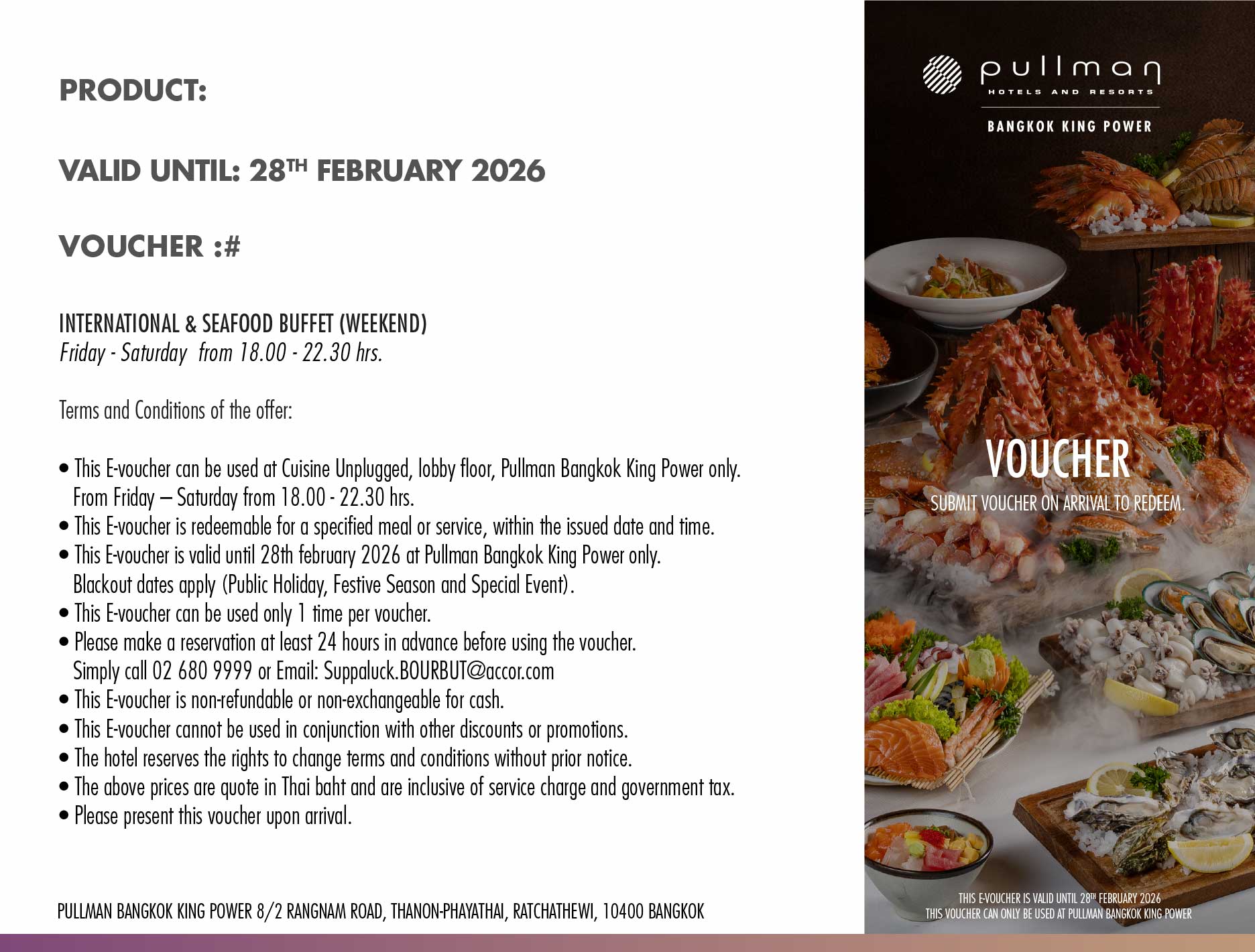 • This E-voucher is valid until 28 February 2026 at Pullman Bangkok King Power only. Blackout dates apply (Public Holiday, Festive Season and Special Event).